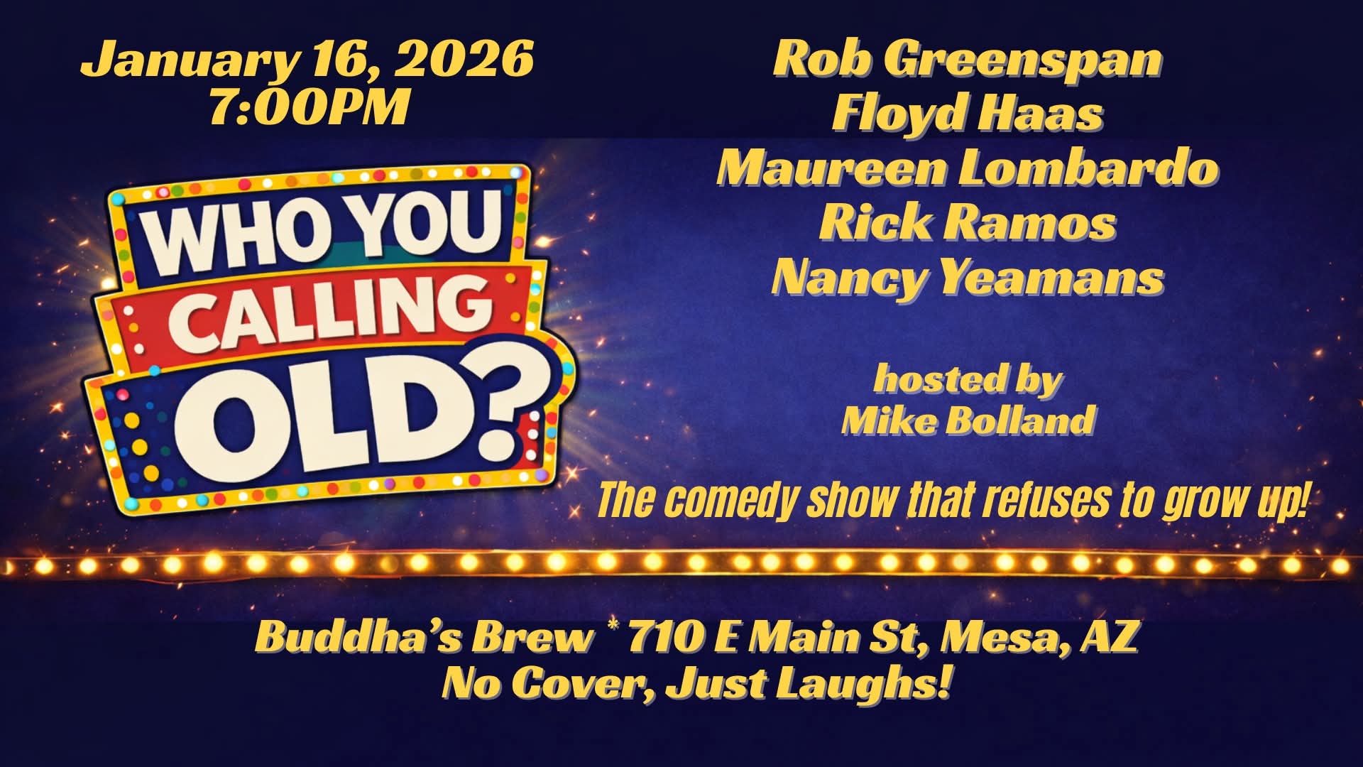 Jarrod's Coffee 109 W University Dr, Mesa, AZ, United StatesOne handed comedian and speaker Mike Bolland will be performing at Jarrod's in Mesa. Who You Calling Old is a comedy show for all ages, where we celebrate life from the perspective of those of us with at least half a century of experience on this planet. The wit, the wisdom and the complete lack of filters we gain as we get older will be load and clear in this showcase of comedians who've been around the block a few times. No more will AARP members, grandparents and the rest of us old codgers be silenced!